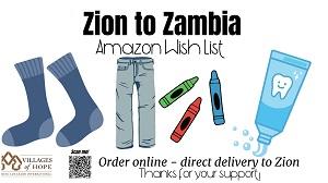 Zion 's team will be traveling to the Village of Hope in Zambia in June. These are items that the Village of Hope has asked us to bring to them. Donations of these items purchased elsewhere, as well as donations of yarn, sturdy deflated sports balls, and ball pumps, can be dropped off in the church office.